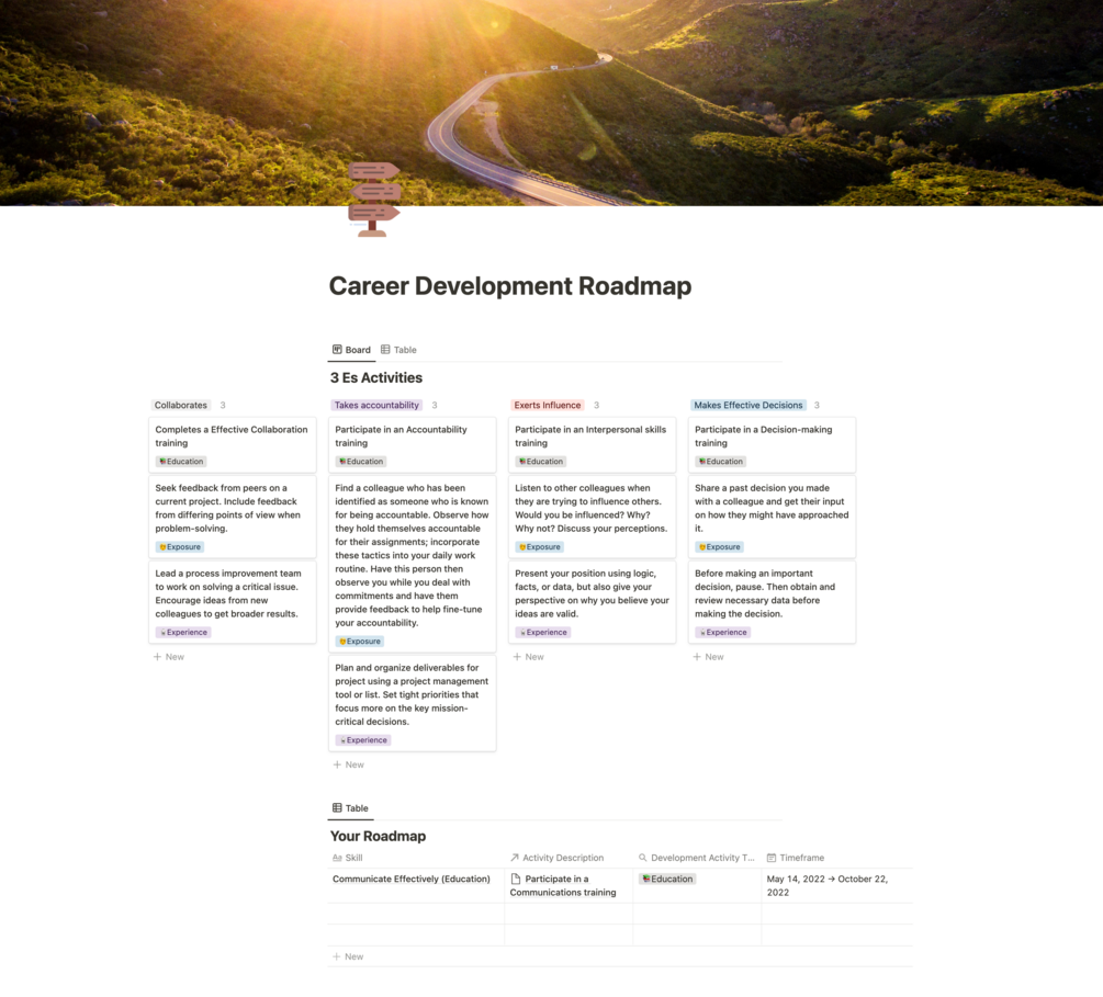 This Notion template leverages a proven career development methodology to guide you through how to establish the stepping stones needed to make incremental progress towards your goals.